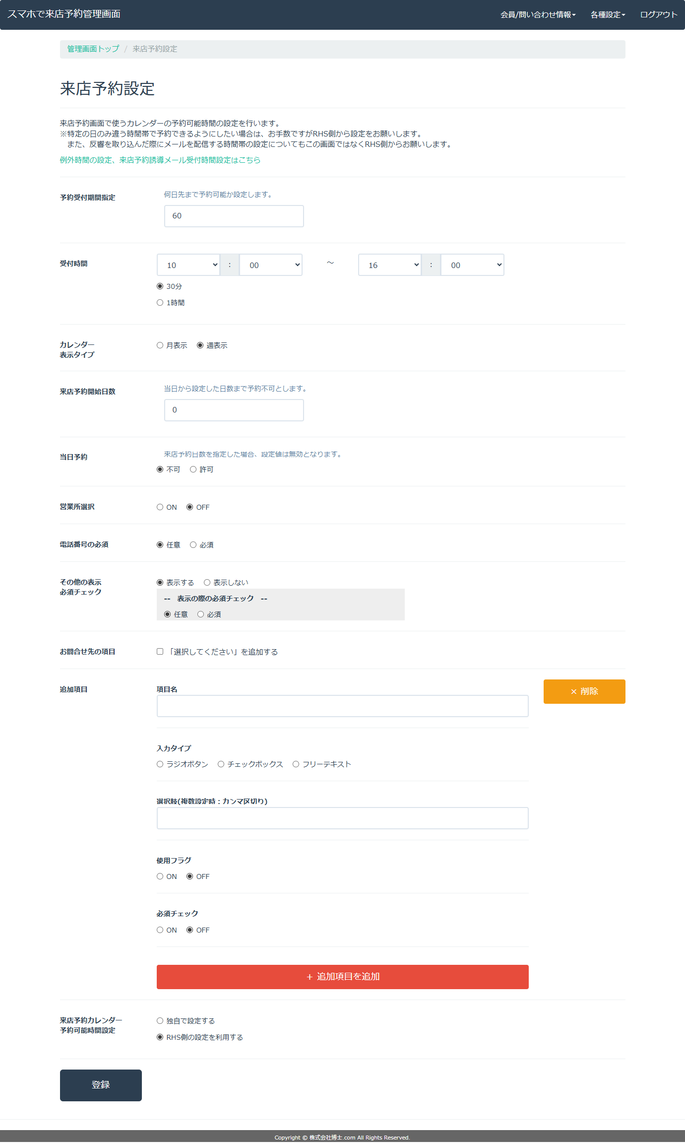 | 追加項目 | 来店予約フォームの追加項目設定 |